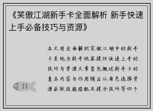 本文将全面解析《笑傲江湖》中的新手卡系统,为新手玩家提供快速上手的技巧与资源。文章首先概述新手卡的基本内容与作用,随后从角色选择、资源获取、技能搭配及提升技巧等四个方面展开深入分析。每个方面都将结合实际游戏场景,详细介绍如何利用新手卡帮助玩家快速适应游戏,提升战力。本文不仅适合新手玩家,也适用于想要优化游戏体验的老玩家,帮助大家在游戏中走得更远,成为笑傲江湖中的强者。